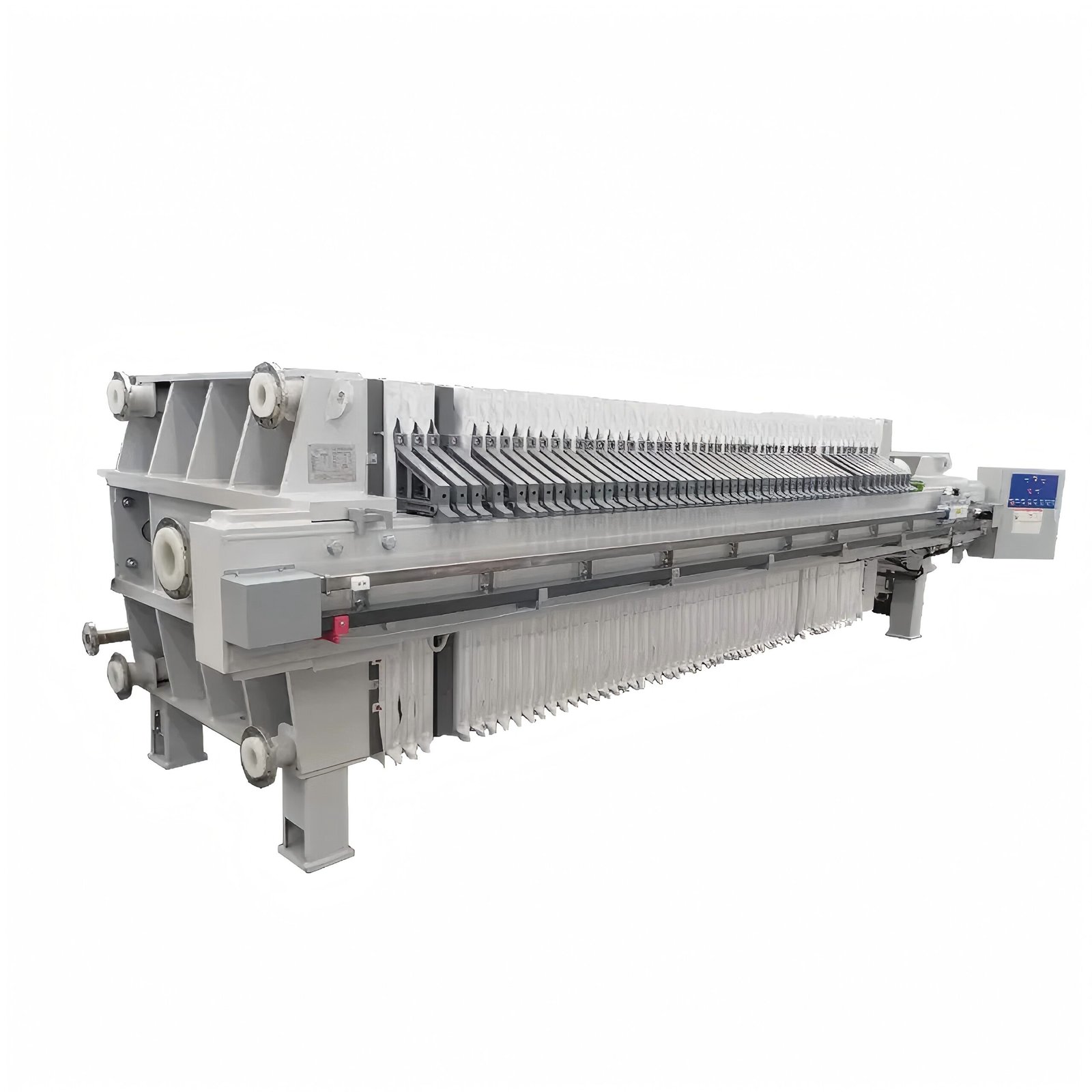 The plate and frame filter press is suitable for suspensions with highly compressible or nearly incompressible filter residues. It typically operates on solid particle concentrations below 10%, with working pressures ranging from 0.3 to 1.6 MPa, and can reach up to 3 MPa under special conditions. The filtration area can be adjusted by modifying the number of plates and frames. The plates are square-shaped, with filter frames measuring 200-2000 mm in inner side length and 16-80 mm in thickness, providing a total filtration area of 1-1200 ㎡m². The plates and frames are secured using manual, electric screw, or hydraulic compression systems. These components are manufactured from materials including wood, cast iron, cast steel, stainless steel, polypropylene, and rubber.