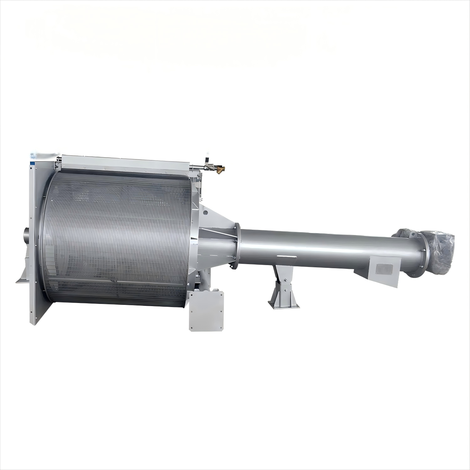 This integrated system combines four core functions: sewage interception, residue removal, screw lifting, and compression dewatering. Installed in water channels at a 35-degree angle to the horizontal plane, the equipment operates with wastewater entering through the drum’s inlet. Water exits via perforated grates on the drum’s sides, where suspended solids and floating debris are retained. As the drum rotates at a controlled speed, nylon brushes and spray nozzles above it continuously remove accumulated residues through screw-lifting mechanisms. The processed residue undergoes dewatering and compression before being discharged into containers or subsequent transport systems, with the entire process remaining clean and odor-free throughout operation.