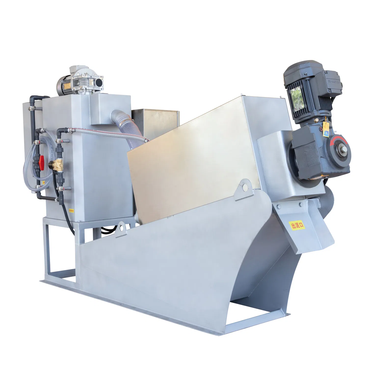 During operation, sludge enters the filter cylinder through the feed port and is propelled toward the discharge port by spiral blades. As the pitch between the spiral blades gradually decreases, the pressure on the sludge increases continuously. Under this pressure differential, dehydration begins, with water flowing out through the filter gaps between stationary and movable rings. The equipment also utilizes self-cleaning mechanisms between fixed and movable plates to maintain unobstructed filtration channels. After thorough dehydration, the sludge cake is discharged through the outlet by the spiral’s continuous rotation. Our company has developed specialized machines tailored to different sludge properties, featuring more practical designs and lower operational costs.